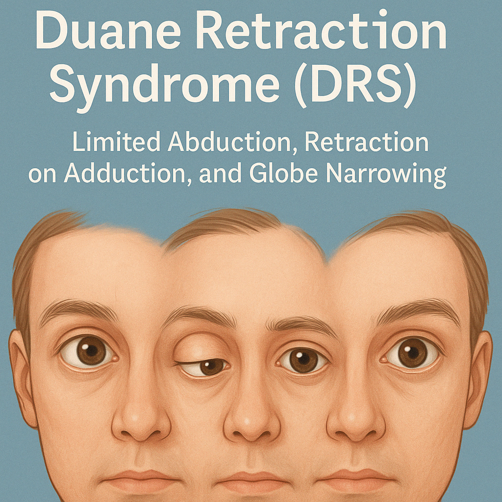 Duane Retraction Syndrome (DRS) is a congenital ocular motility disorder caused by miswiring of cranial nerves, primarily affecting abduction/adduction and causing globe retraction and palpebral fissure narrowing.