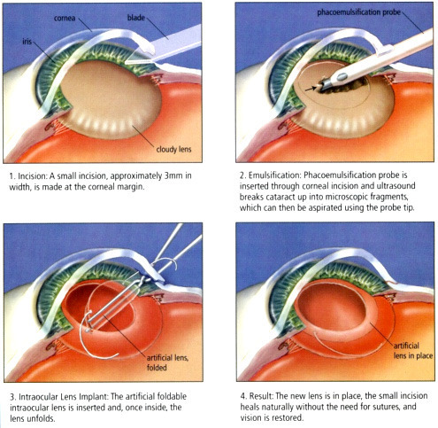 - The cloudy lens is fragmented and removed via ultrasound energy