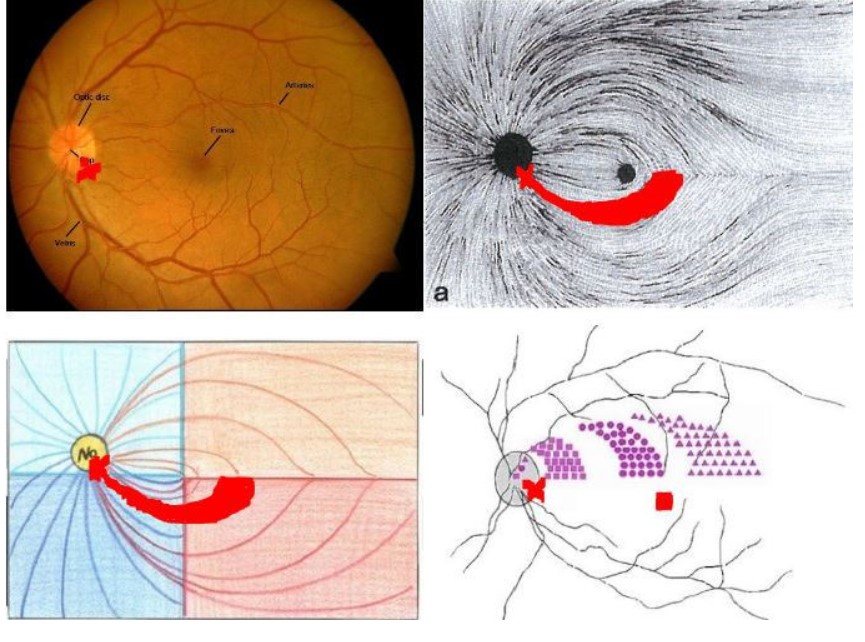 IOP ↑ → IT optic disc cupping → RNFL IT loss → upper nasal scotoma