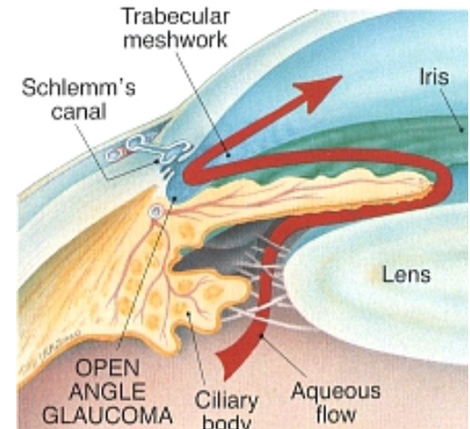 - Microscopic trabecular meshwork dysfunction → IOP elevation