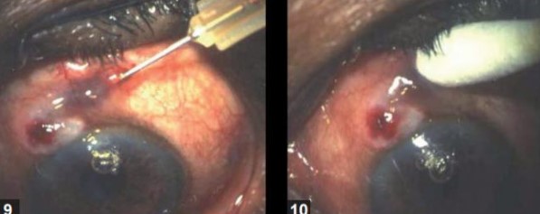 - Uses a cotton swab to press over the scleral flap at slit lamp