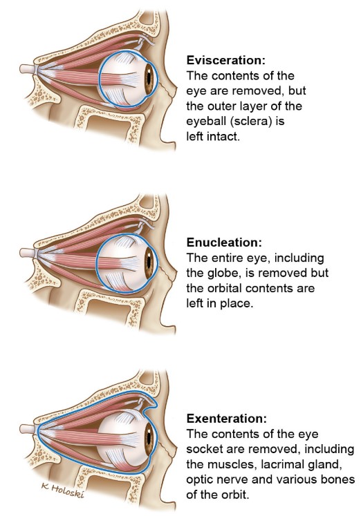 | Evisceration | Removes cornea and intraocular contents, spares sclera |